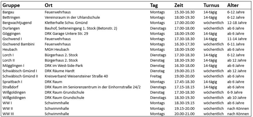 Kontaktieren Sie uns gerne bei Interesse an der Teilnahme in einer der Gruppen. Wir vermitteln Sie dann an die gewünschte Gruppe. Es ist bei allen Gruppen möglich, nach Vereinbarung zum Schnuppern vorbeizukommen. Bitte beachten Sie, dass es immer wieder zu Änderungen der Uhrzeiten kommen kann, und es eventuell sein kann, dass die Daten kurzfristig veraltet sind.